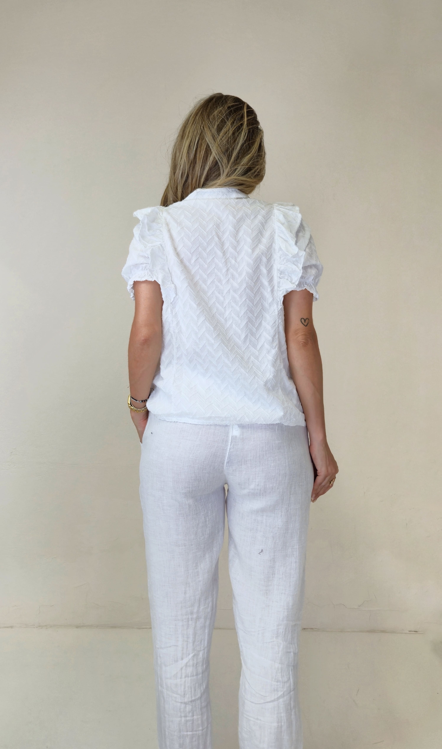Blusa blanca con textura en zigzag.