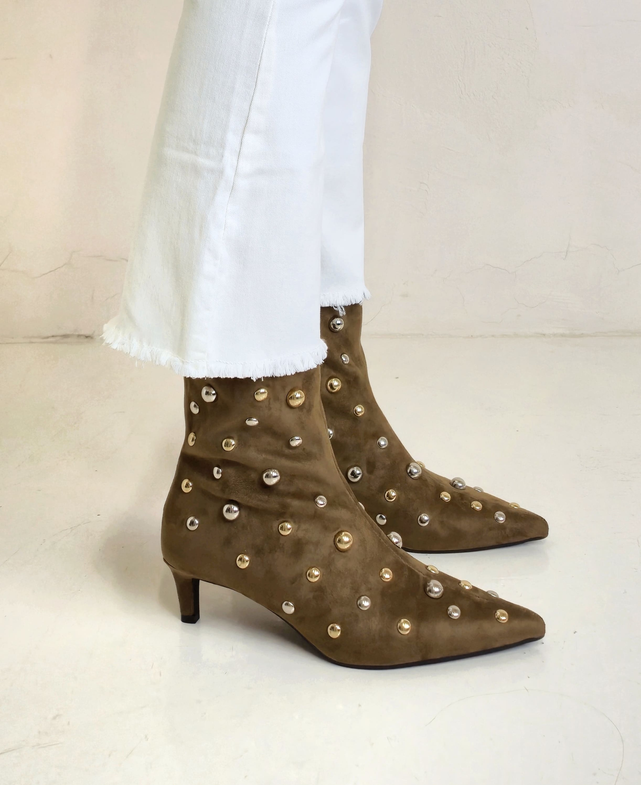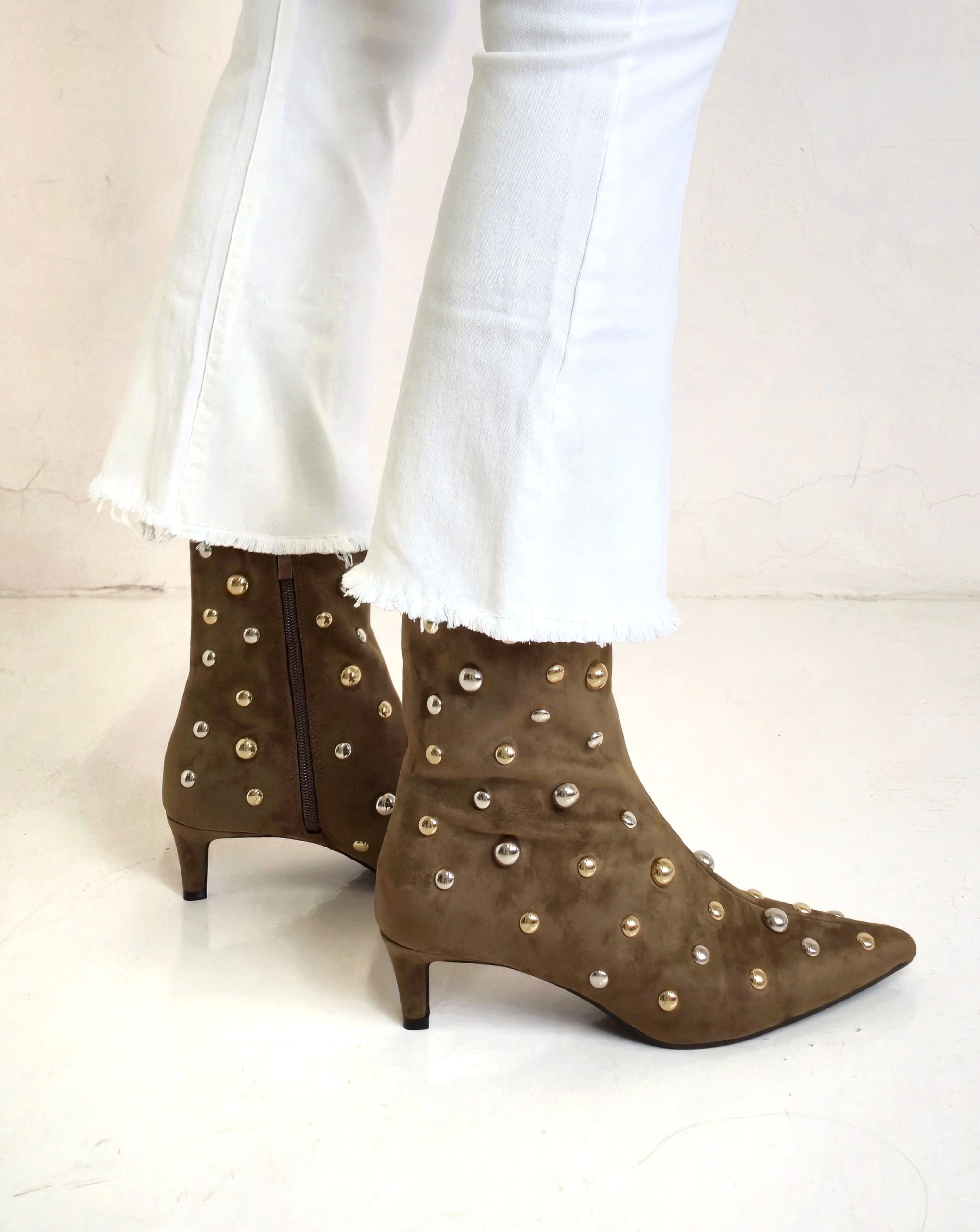 Botín marrón con tachas plata y oro.