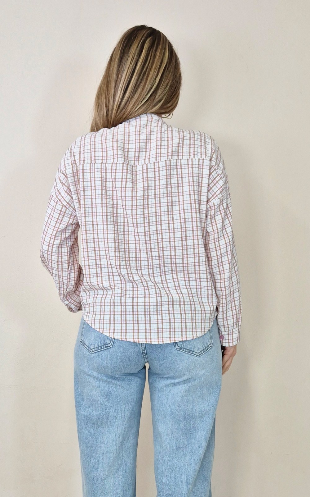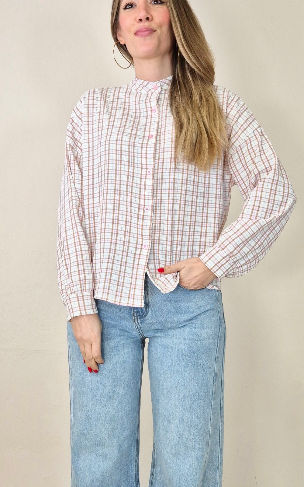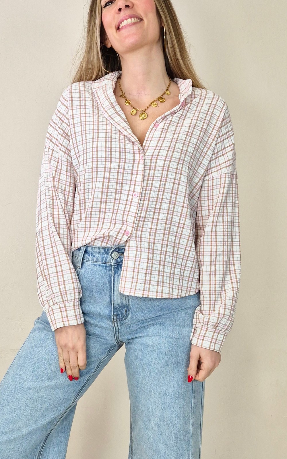 Blusa ligera de cuadros en tonos rosa y beige, con manga larga y cierre delantero de botones. Un diseño sencillo y fácil de combinar, perfecto para llevar con vaqueros o pantalón claro.
