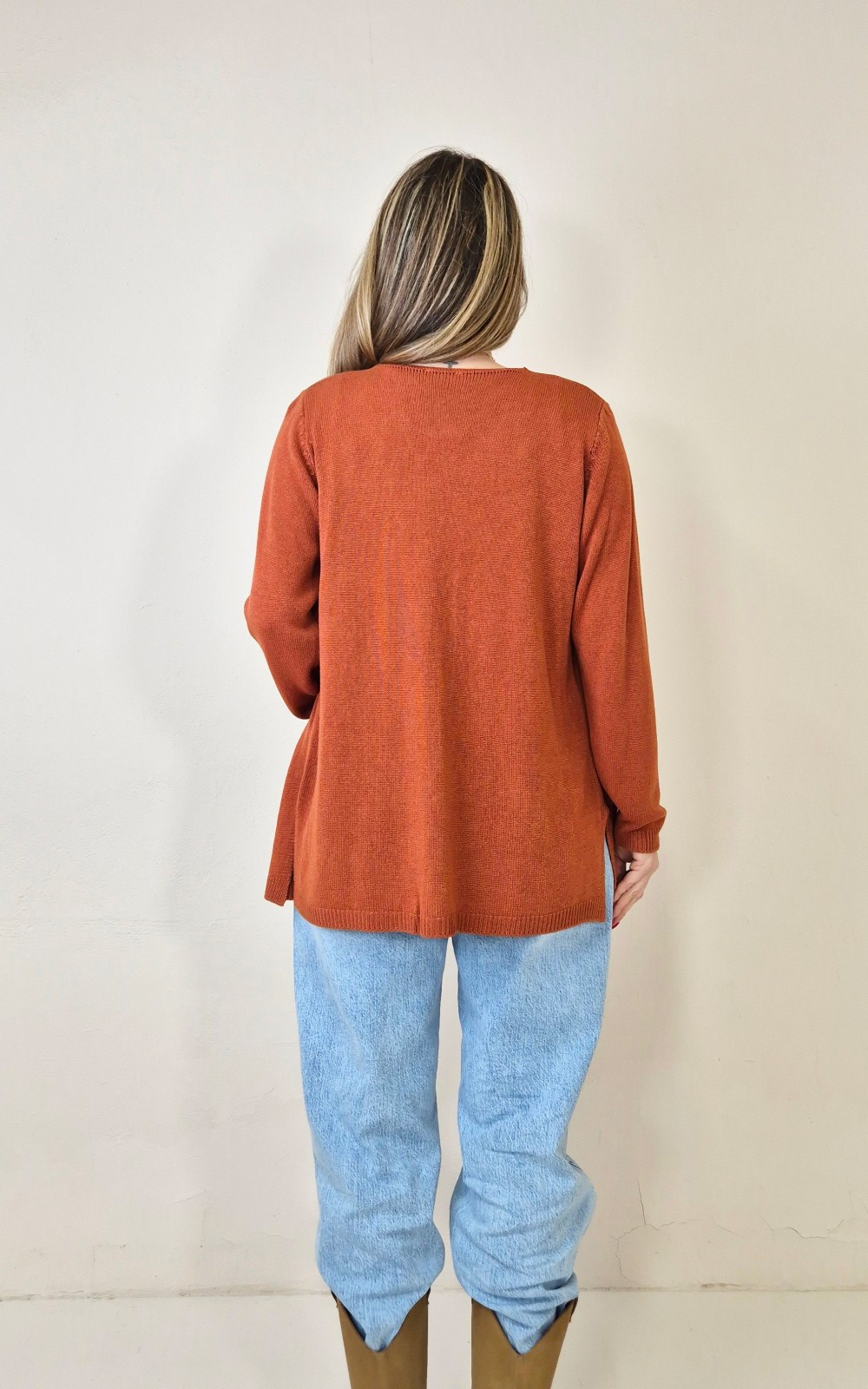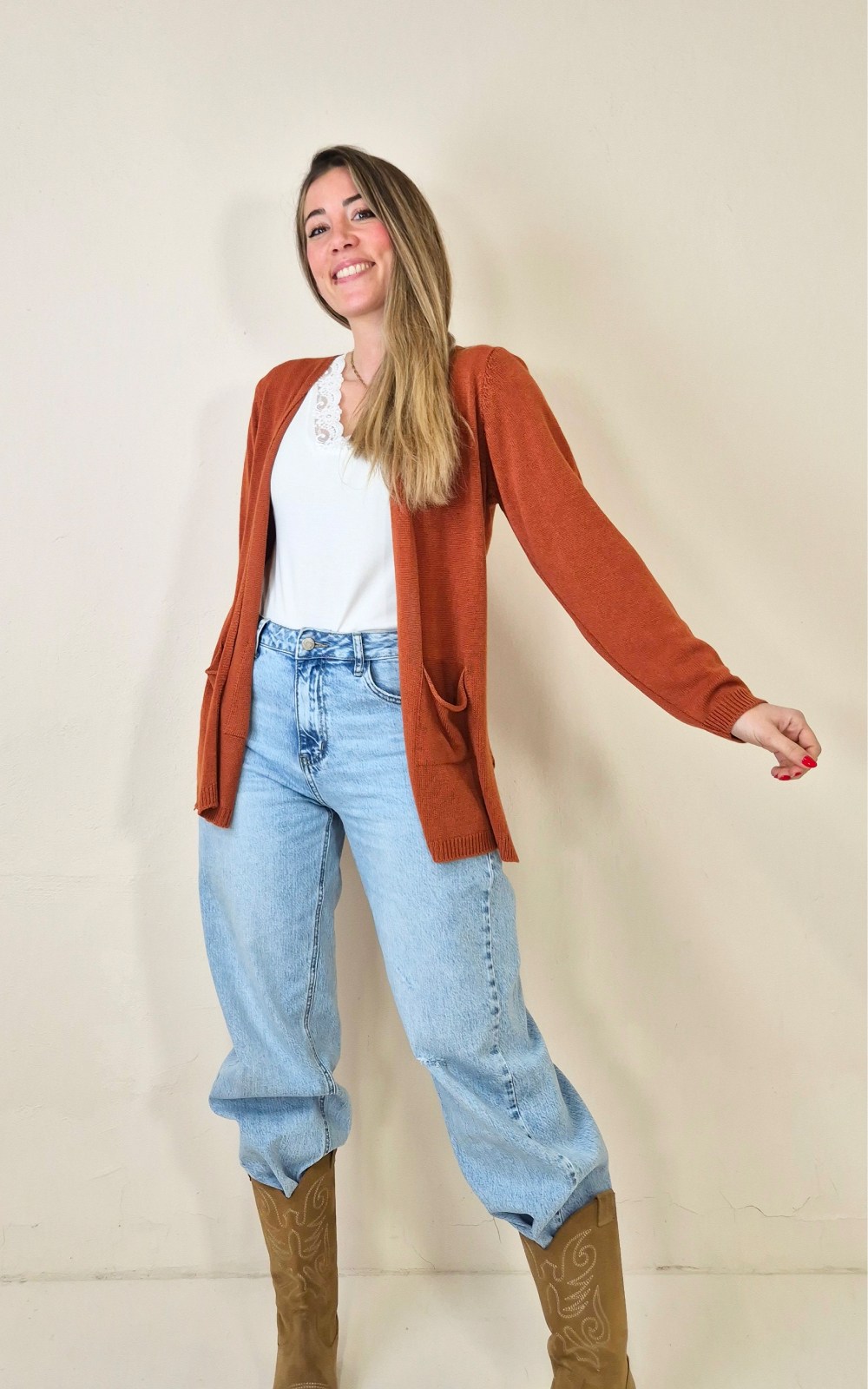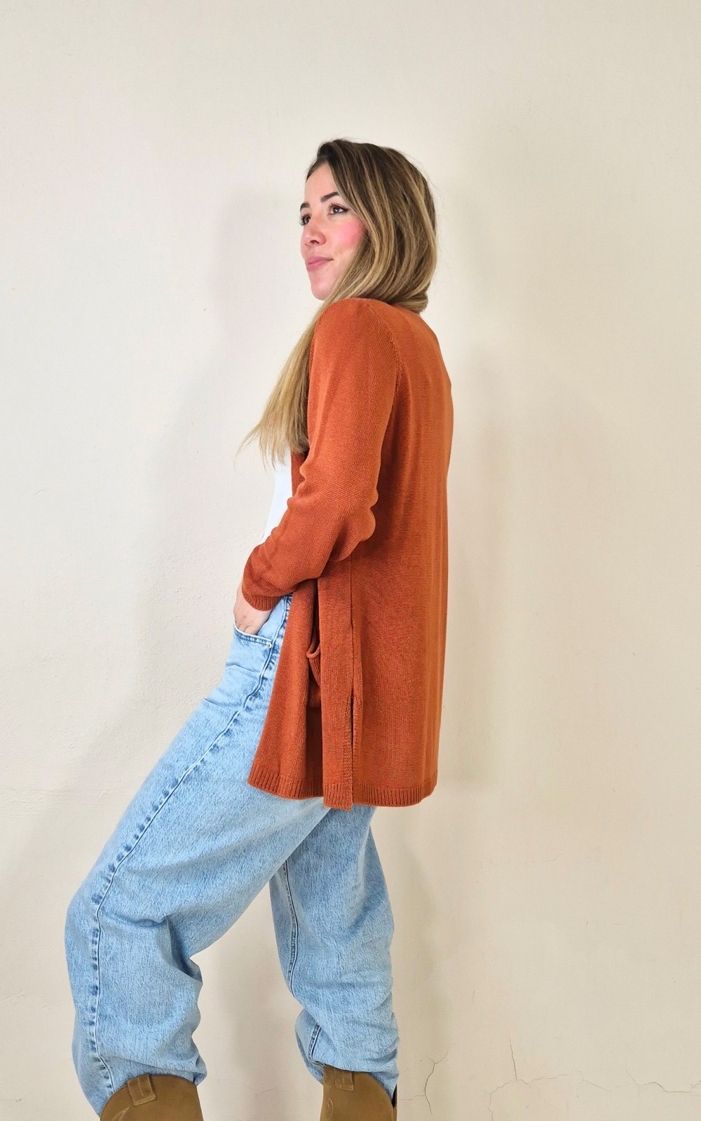 Chaqueta de punto fina y suave en tono teja claro, fácil de combinar y perfecta para entretiempo. Su diseño abierto y los bolsillos delanteros la convierten en una prenda cómoda y práctica para llevar sobre camisetas, tops o blusas.