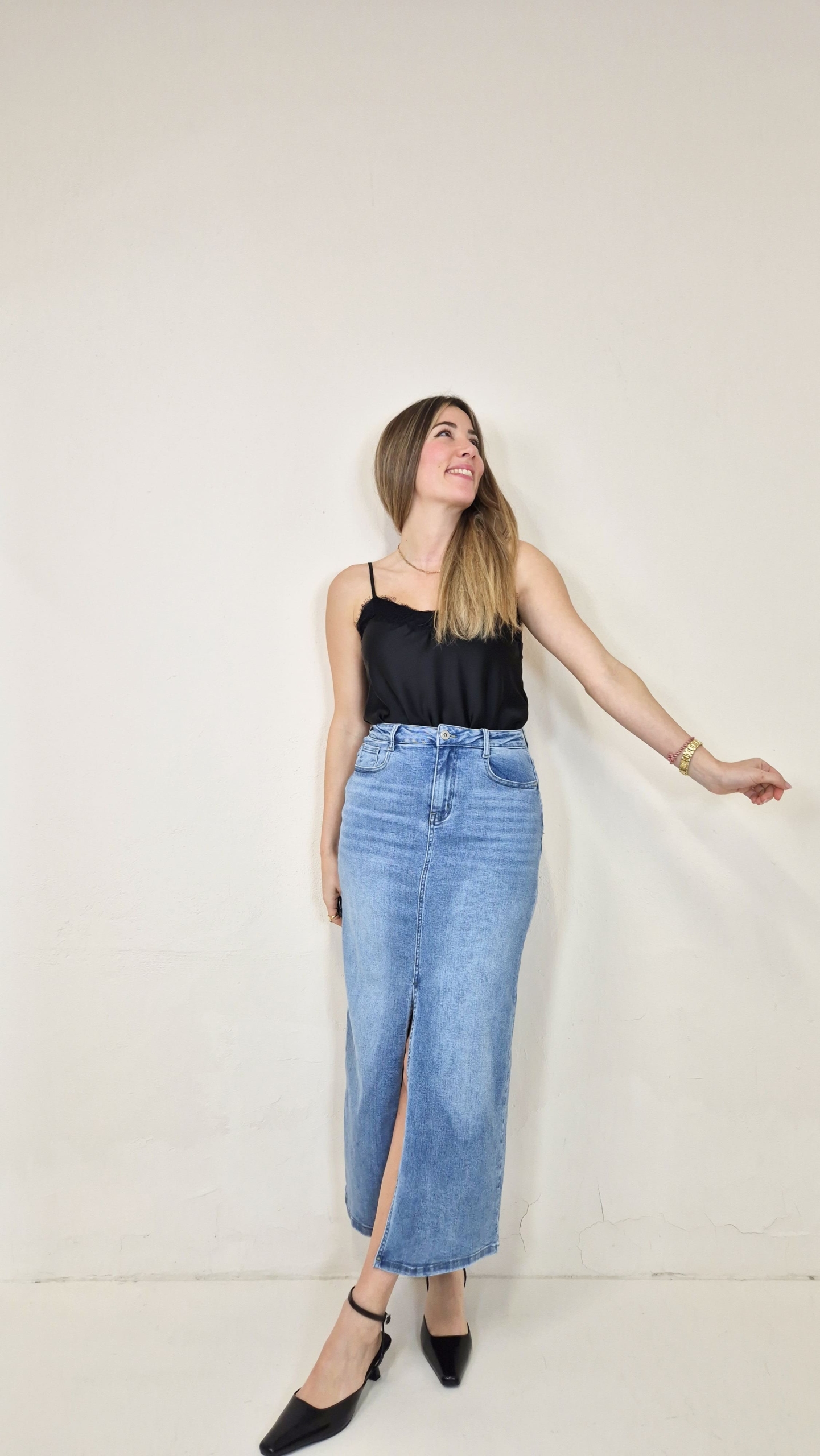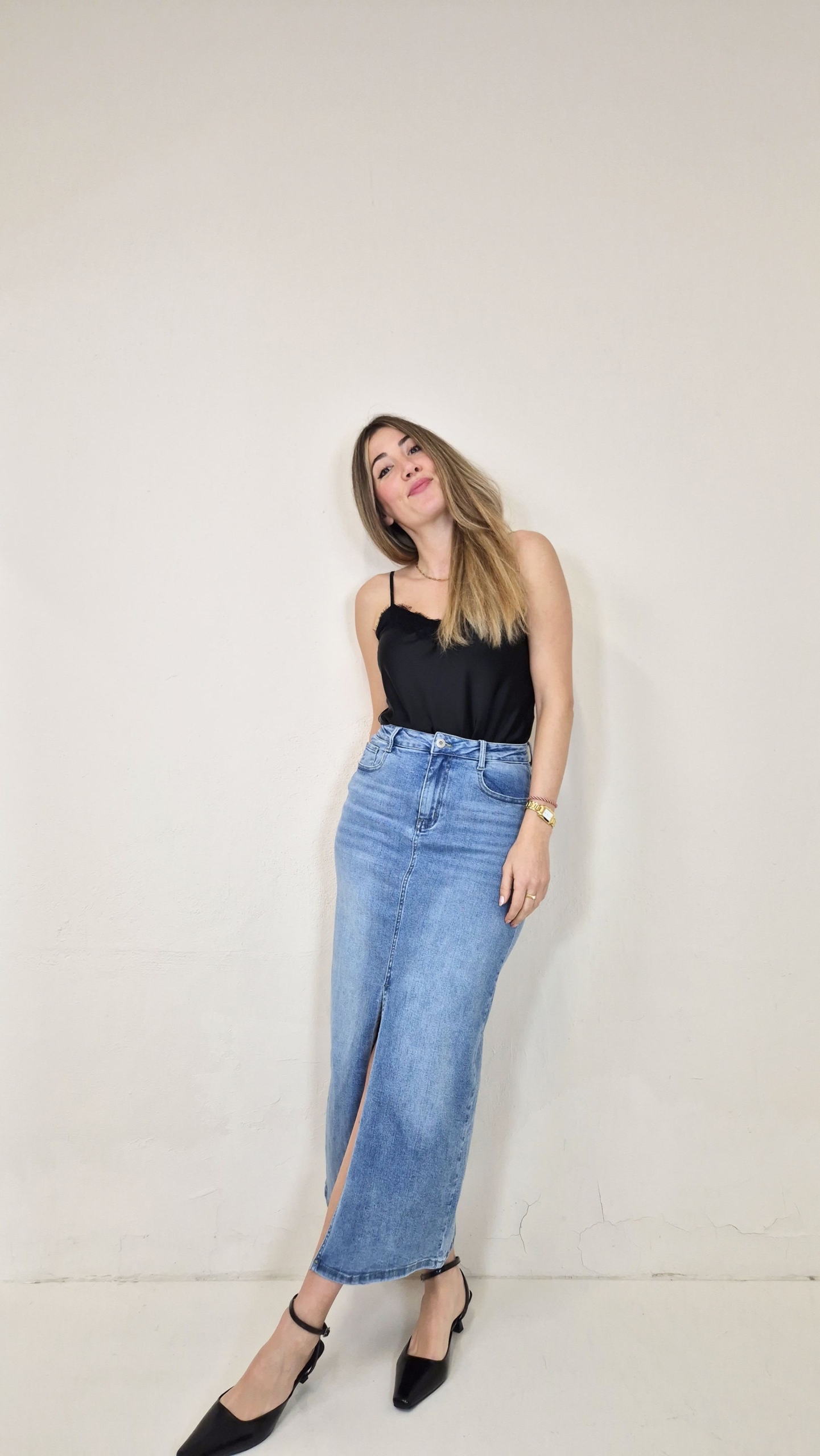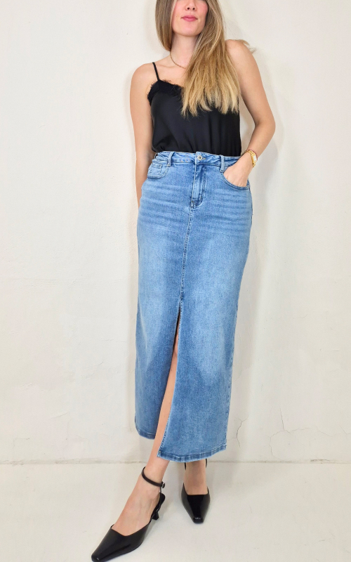 Falda vaquera de corte midi.