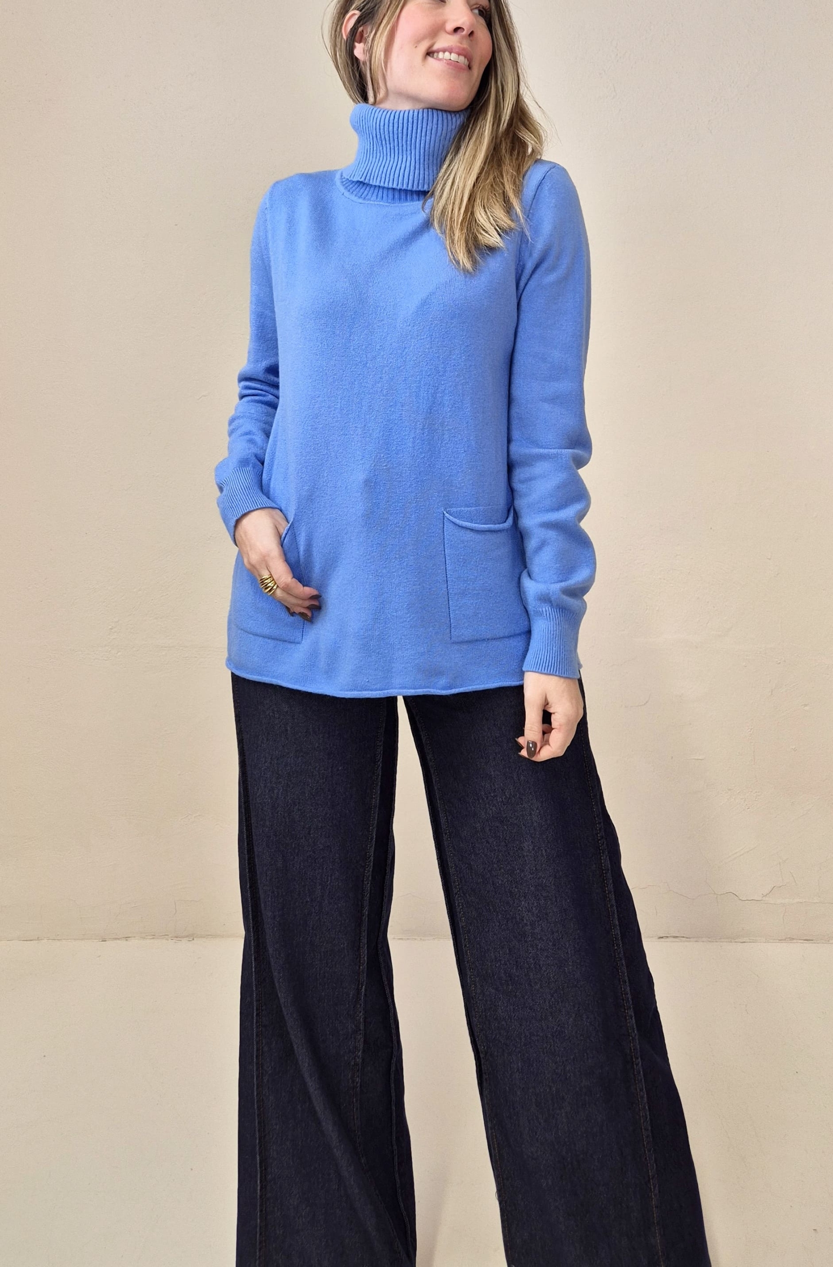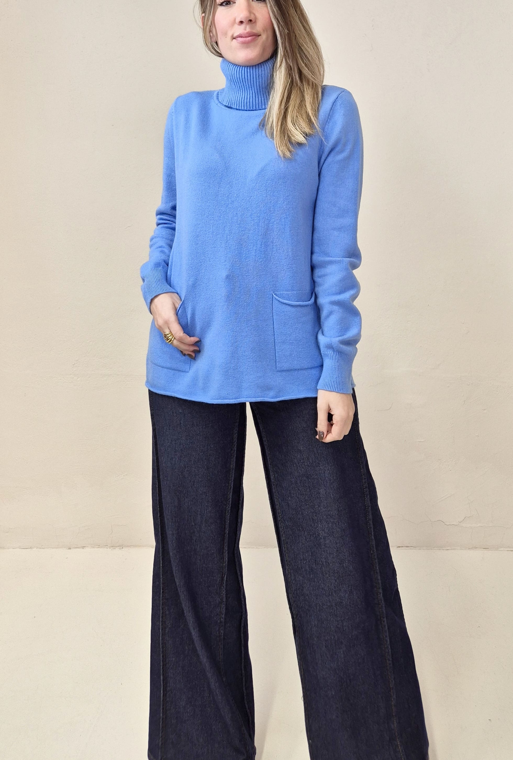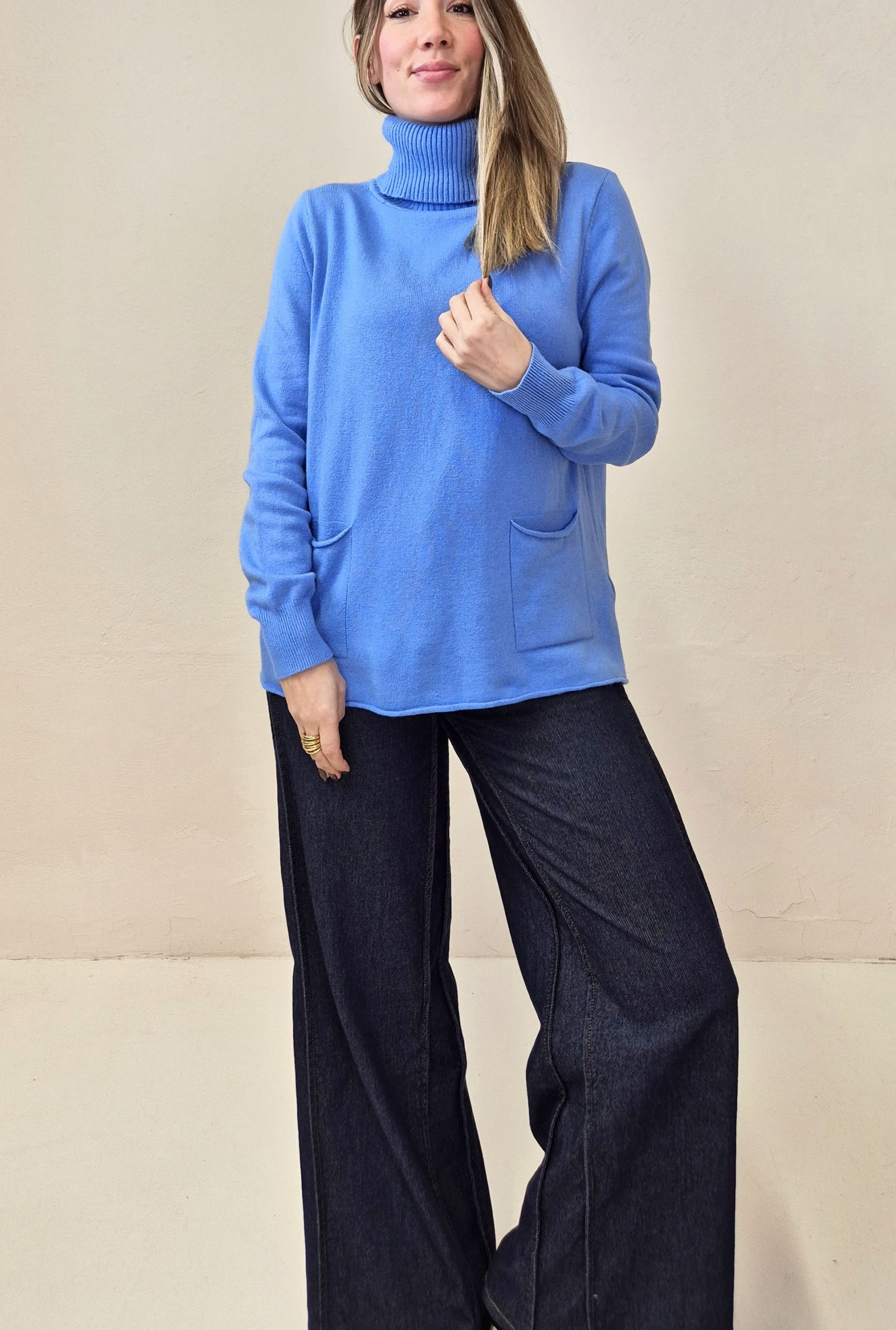 Jersey de punto color azulón con cuello alto y bolsillos frontales.