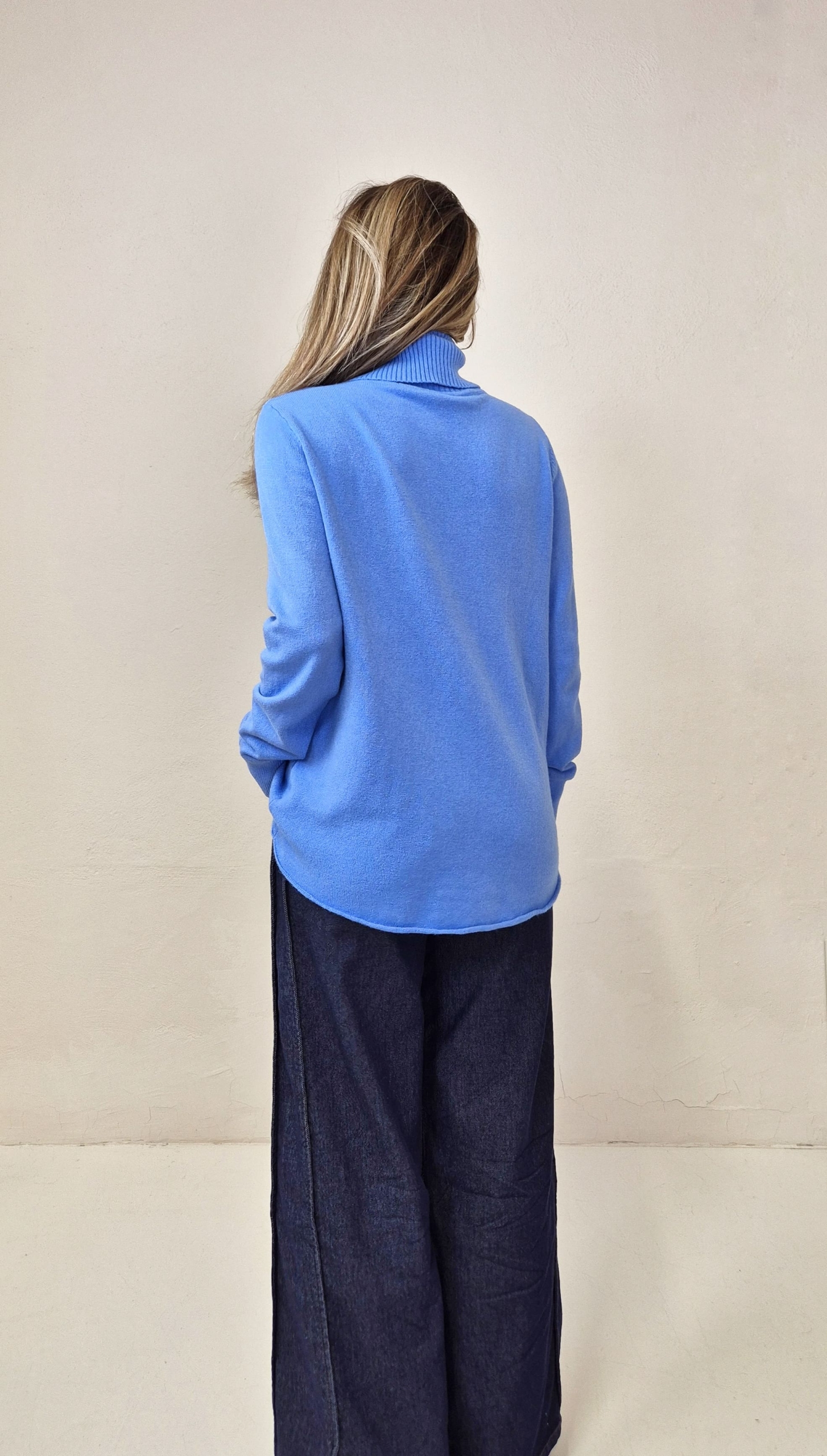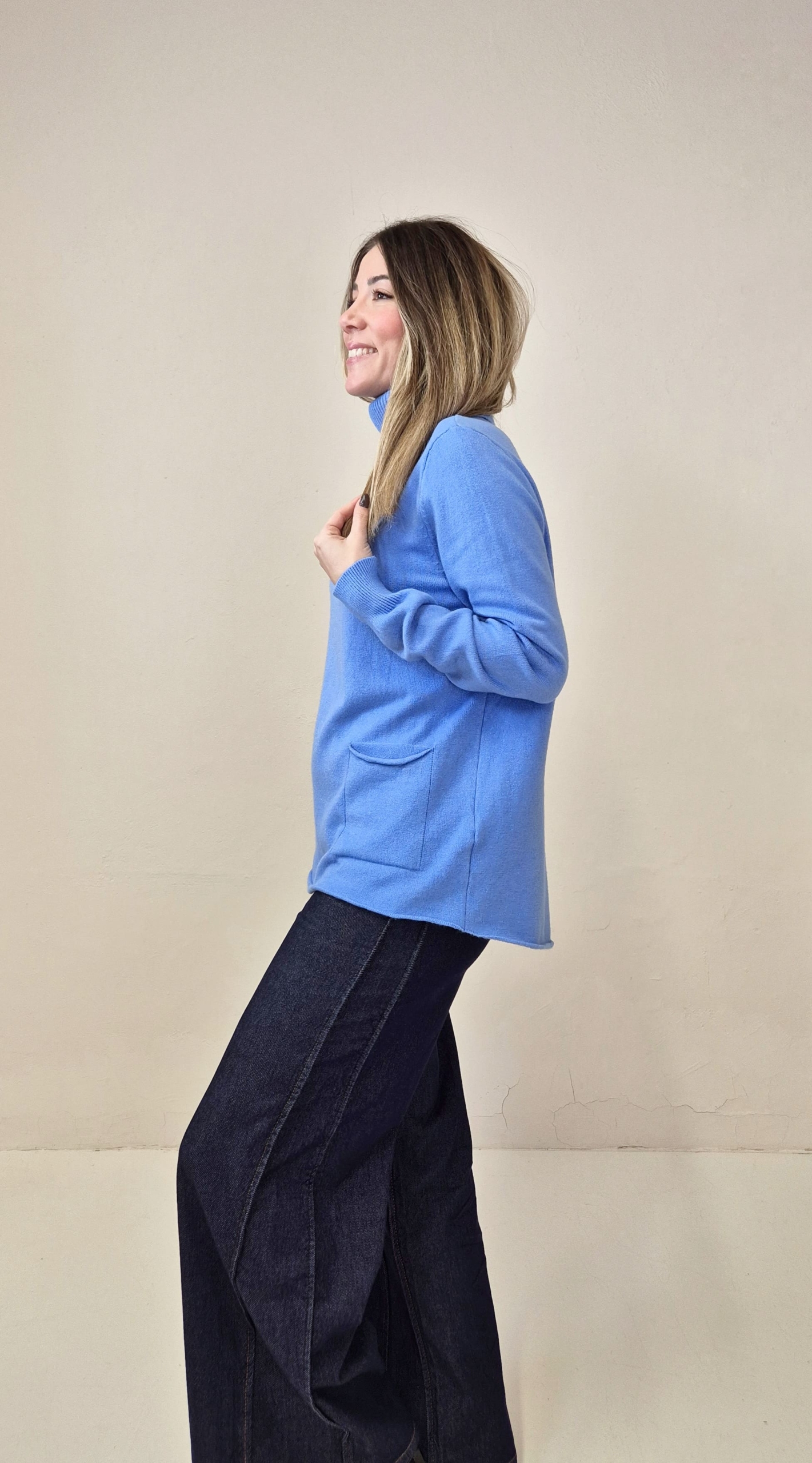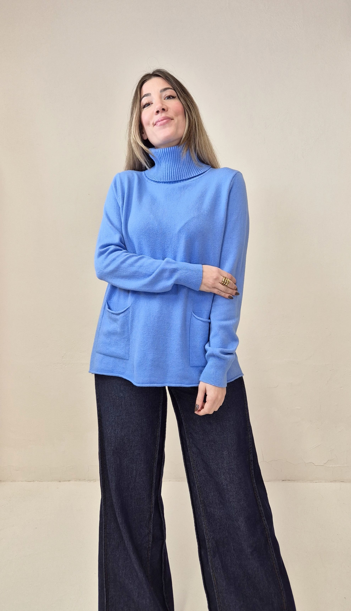Jersey de punto color azulón con cuello alto y bolsillos frontales.