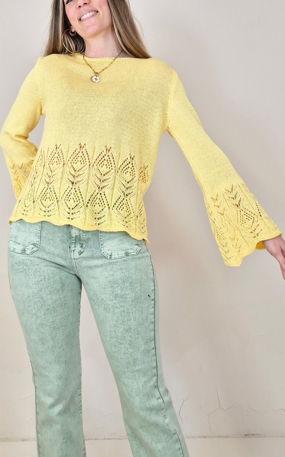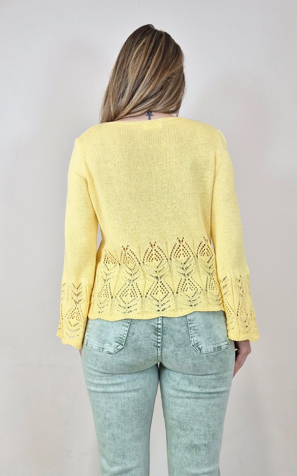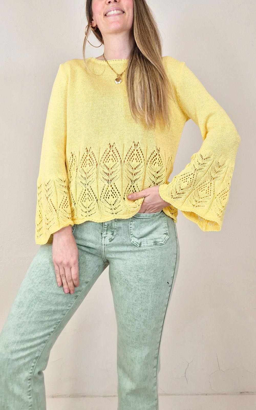 Jersey de punto fino en color amarillo, con detalle calado en la parte baja y en las mangas. Lleva manga larga ligeramente acampanada y un corte cómodo, fácil de combinar para diario. Talla única, con buen ajuste desde XS hasta L.