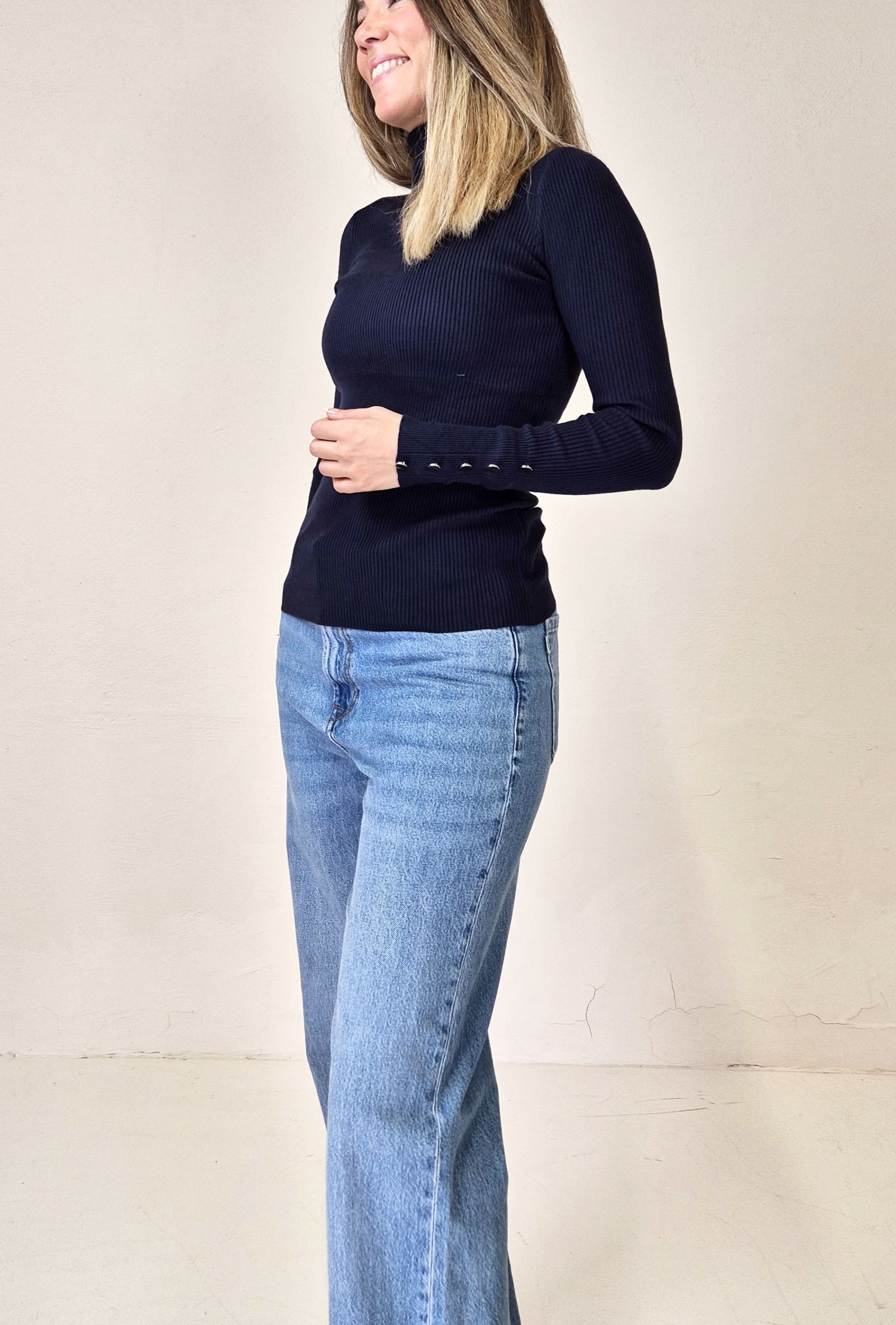 Manga larga y cuello alto.