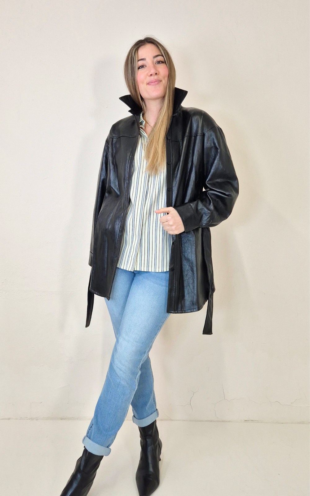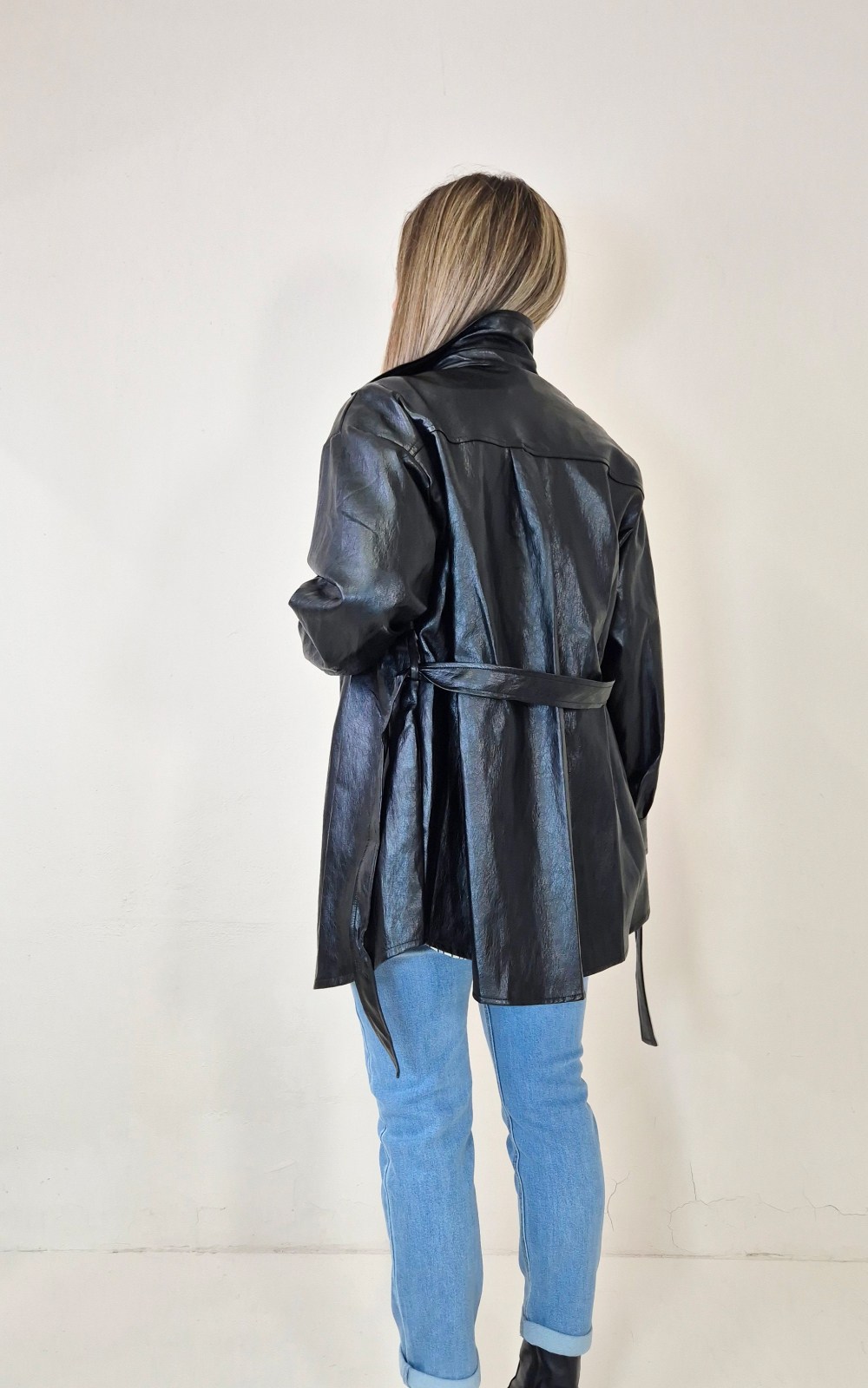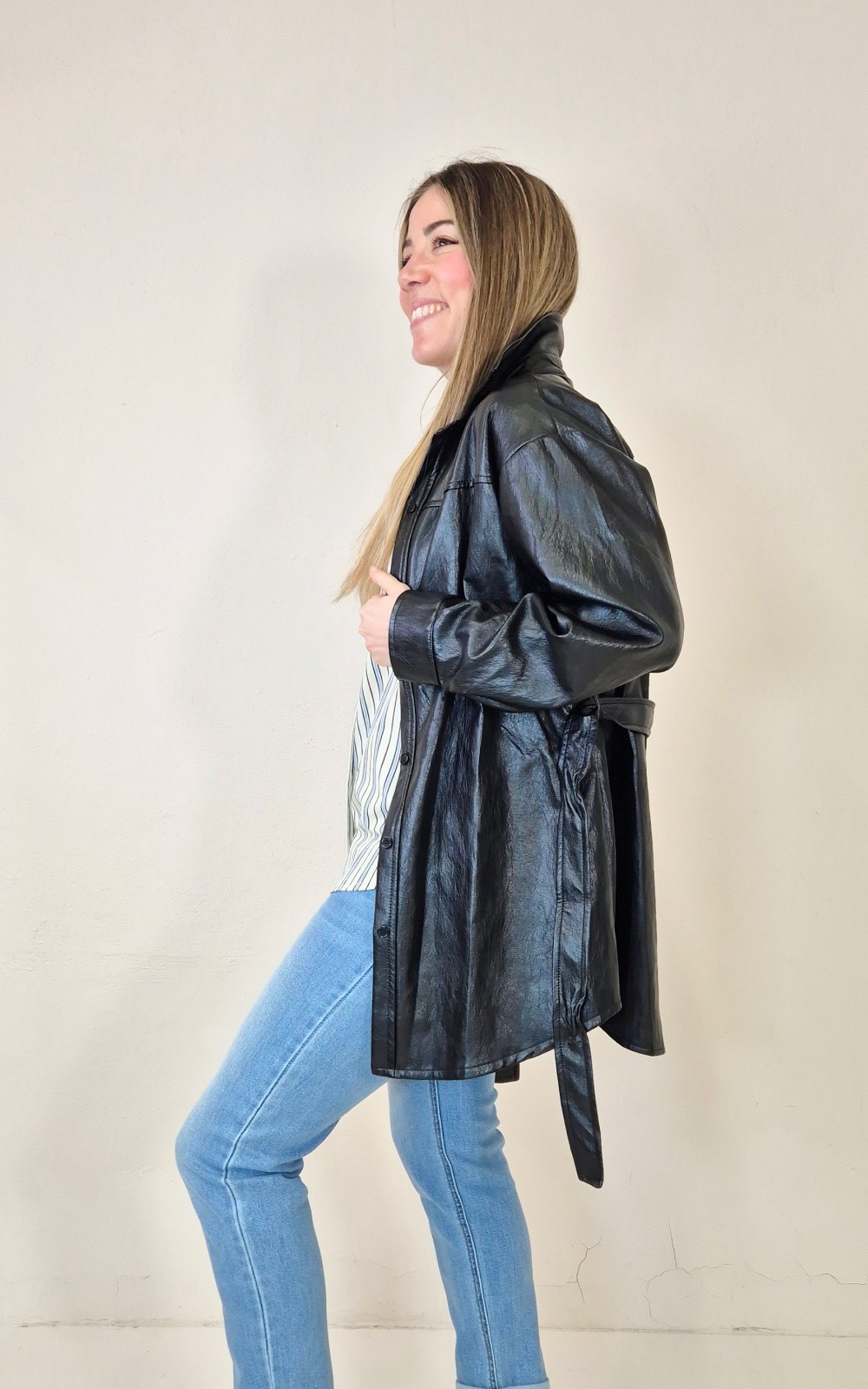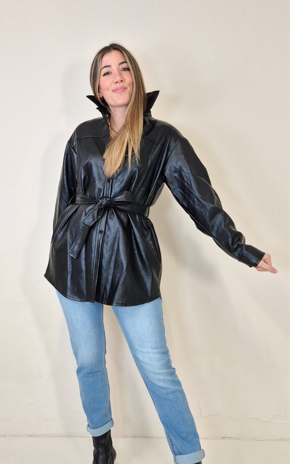 Sobrecamisa negra de piel sintética, talla única. Diseñada con cuello camisero, cierre frontal de botones y cinturón para ajustar a la cintura. Lleva bolsillos laterales que la hacen muy práctica y cómoda. Una prenda perfecta para dar un toque cañero a cualquier look.