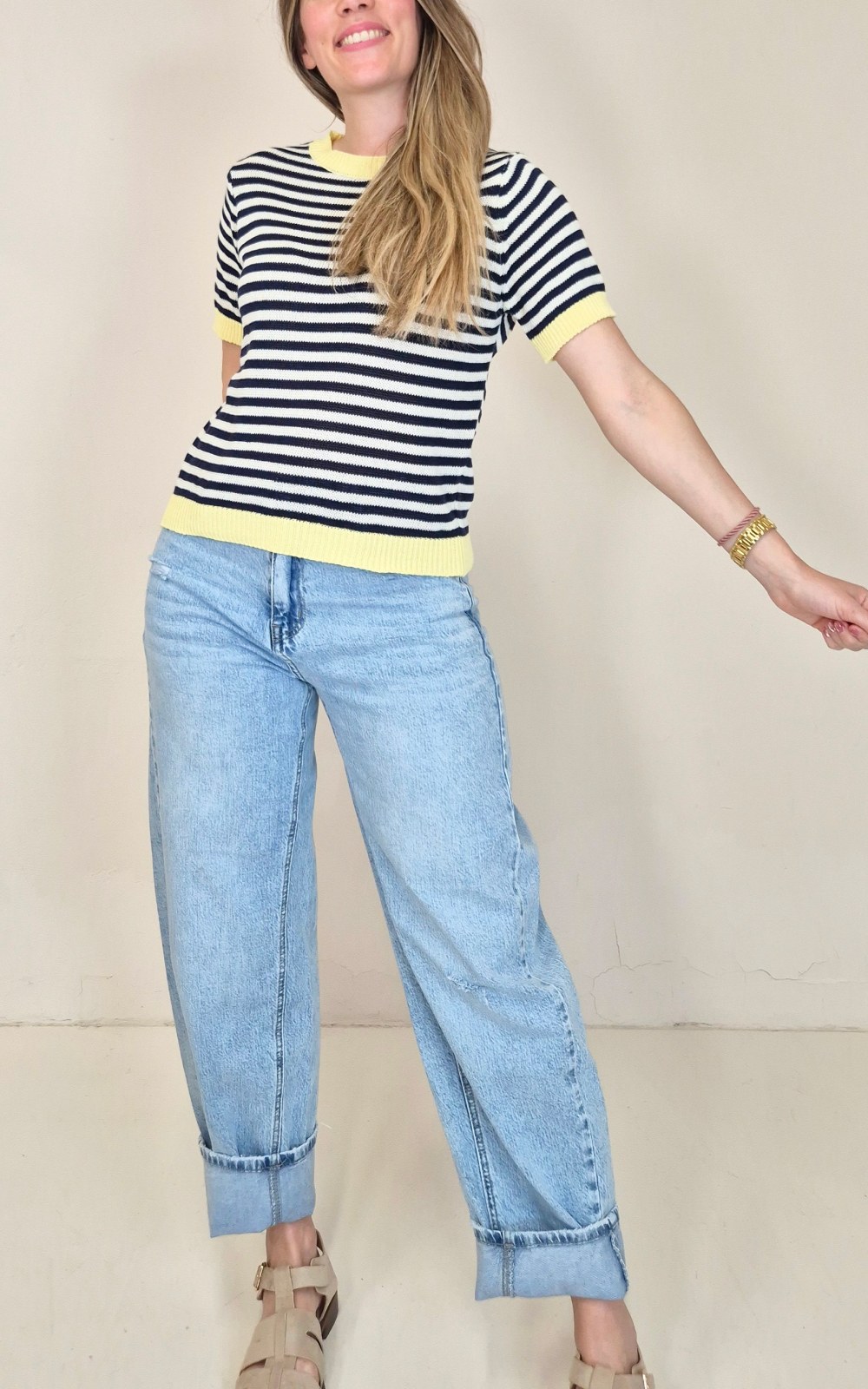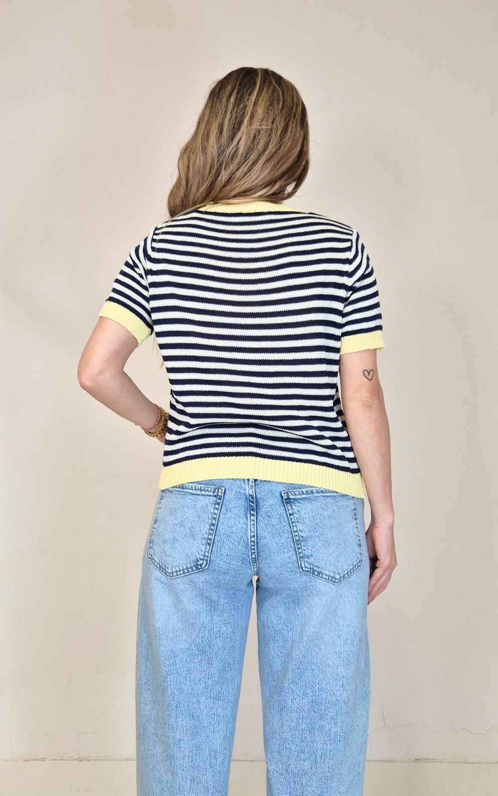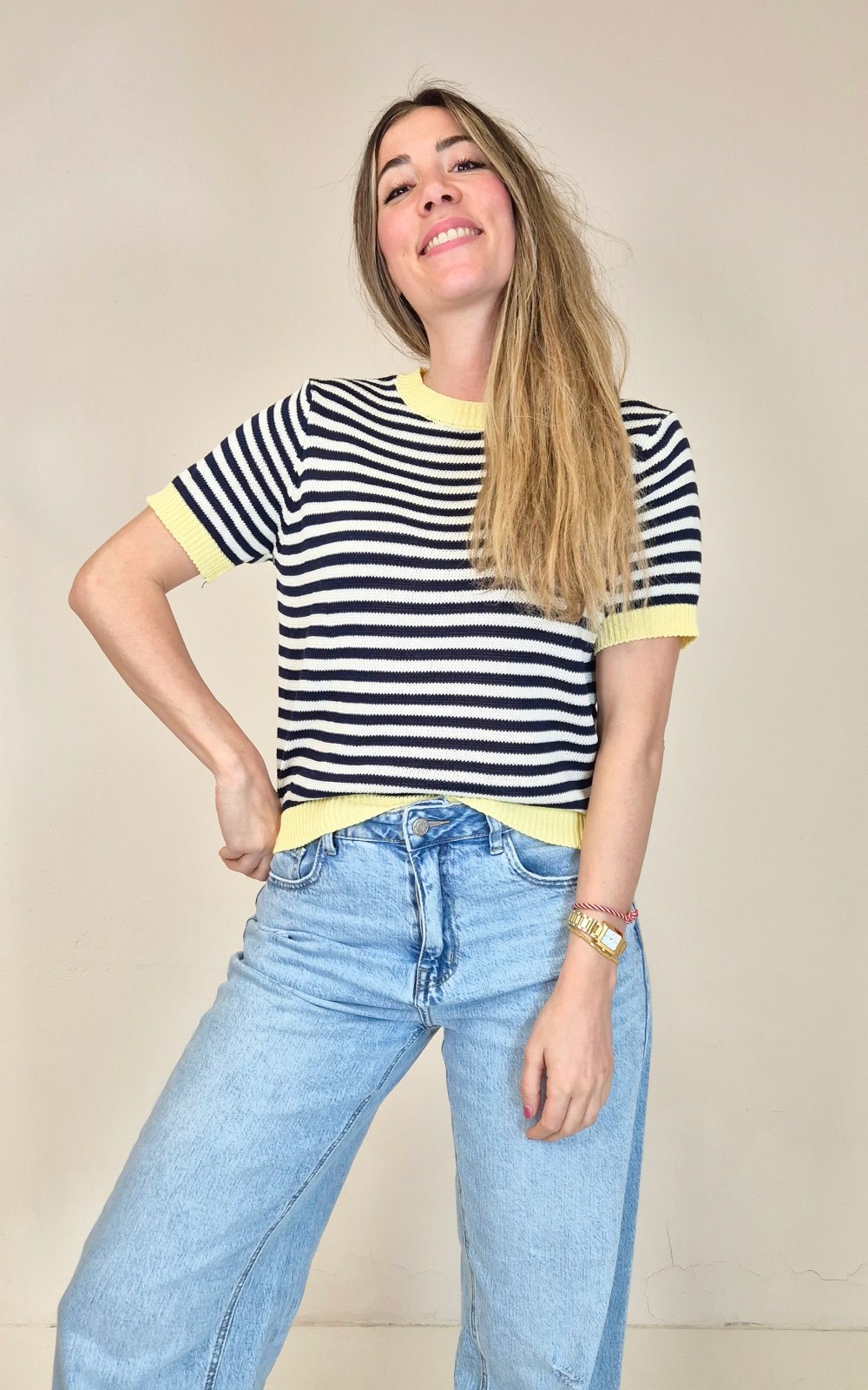 Jersey de punto de manga corta con diseño de rayas en tonos beige y azul, combinado con acabado en amarillo en cuello, mangas y bajo. Un top cómodo y fácil de llevar, perfecto para dar un toque de color a cualquier look de diario.