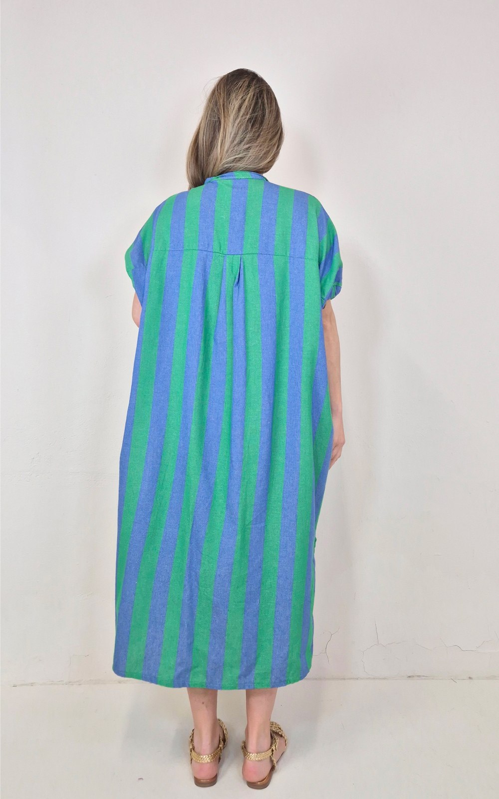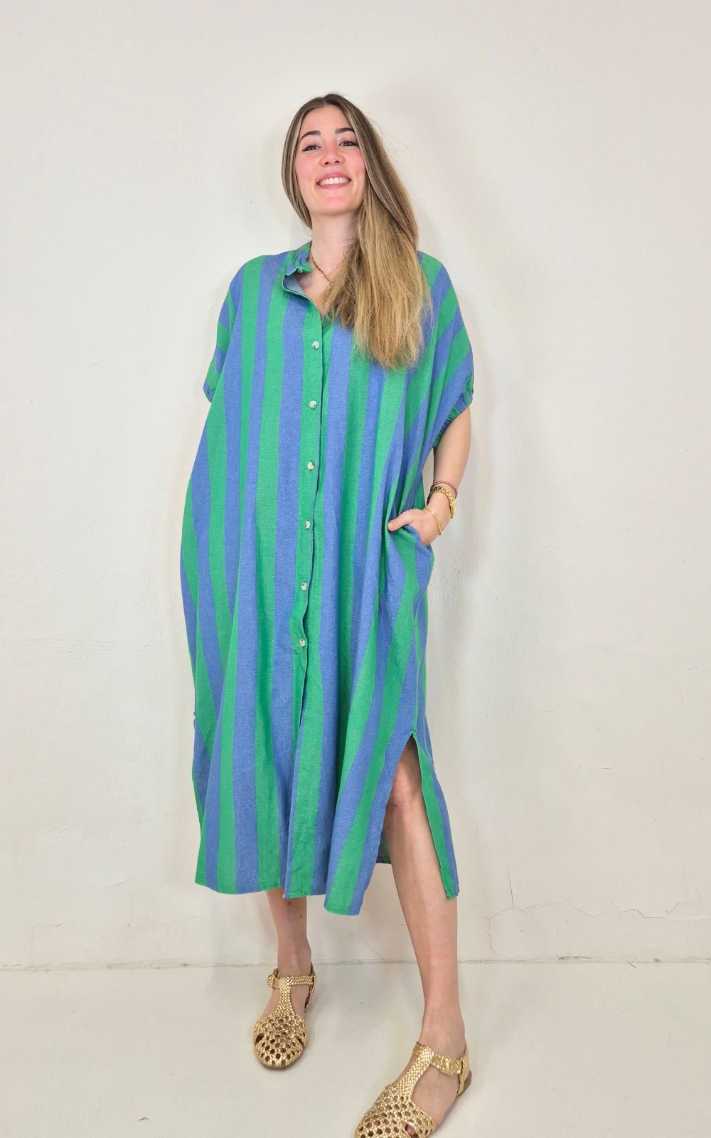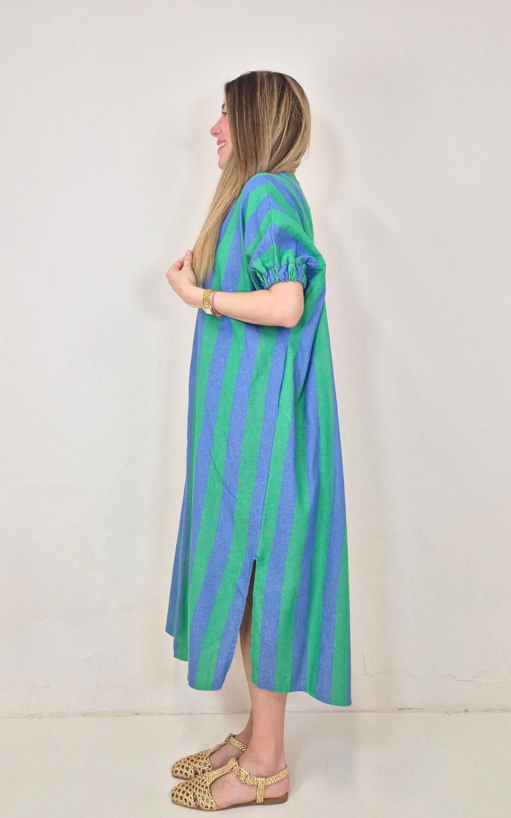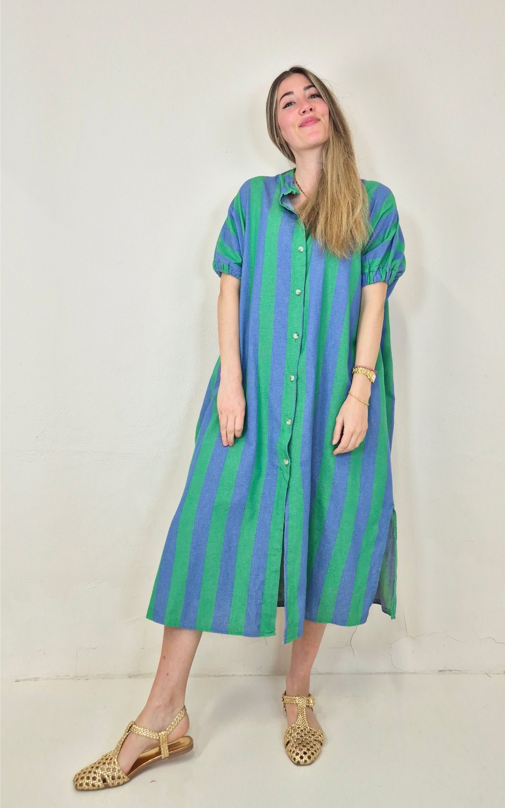 Vestido largo oversize de rayas en verde flúor y azul, una prenda cómoda y con mucha presencia para el día a día o para looks especiales de verano. Tiene cuello camisero, cierre frontal de botones y manga corta abullonada, que le da un punto especial sin perder comodidad. Su corte amplio hace que siente suelto, favorecedor y muy fácil de llevar.