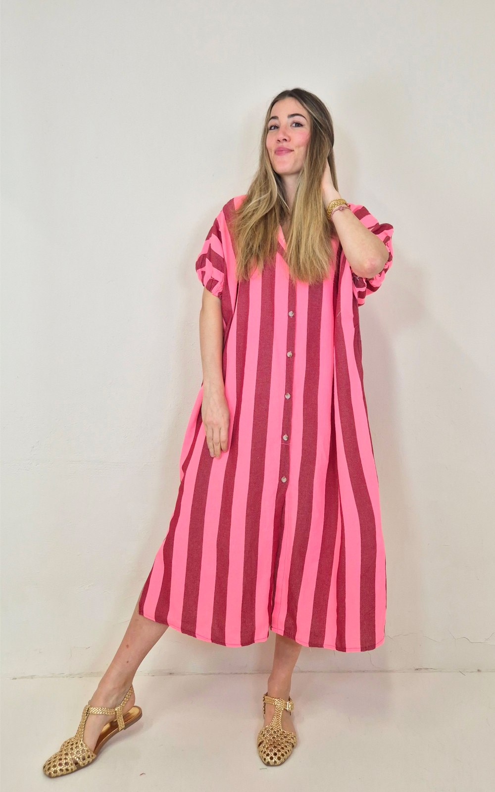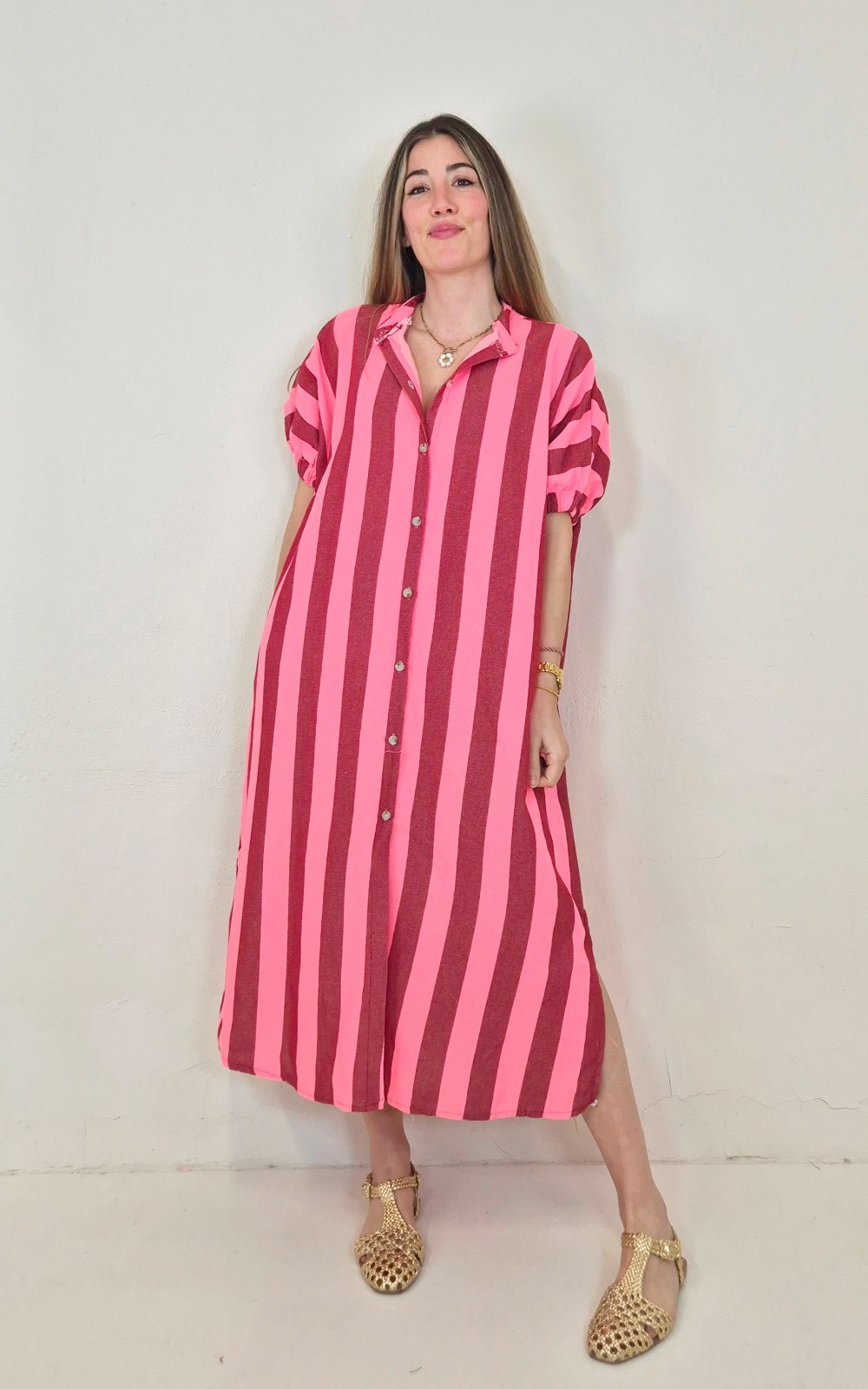 Vestido largo oversize de rayas en rosa flúor y granate, una prenda cómoda y con mucha presencia para el día a día o para looks especiales de verano. Tiene cuello camisero, cierre frontal de botones y manga corta abullonada, que le da un punto especial sin perder comodidad. Su corte amplio hace que siente suelto, favorecedor y muy fácil de llevar.