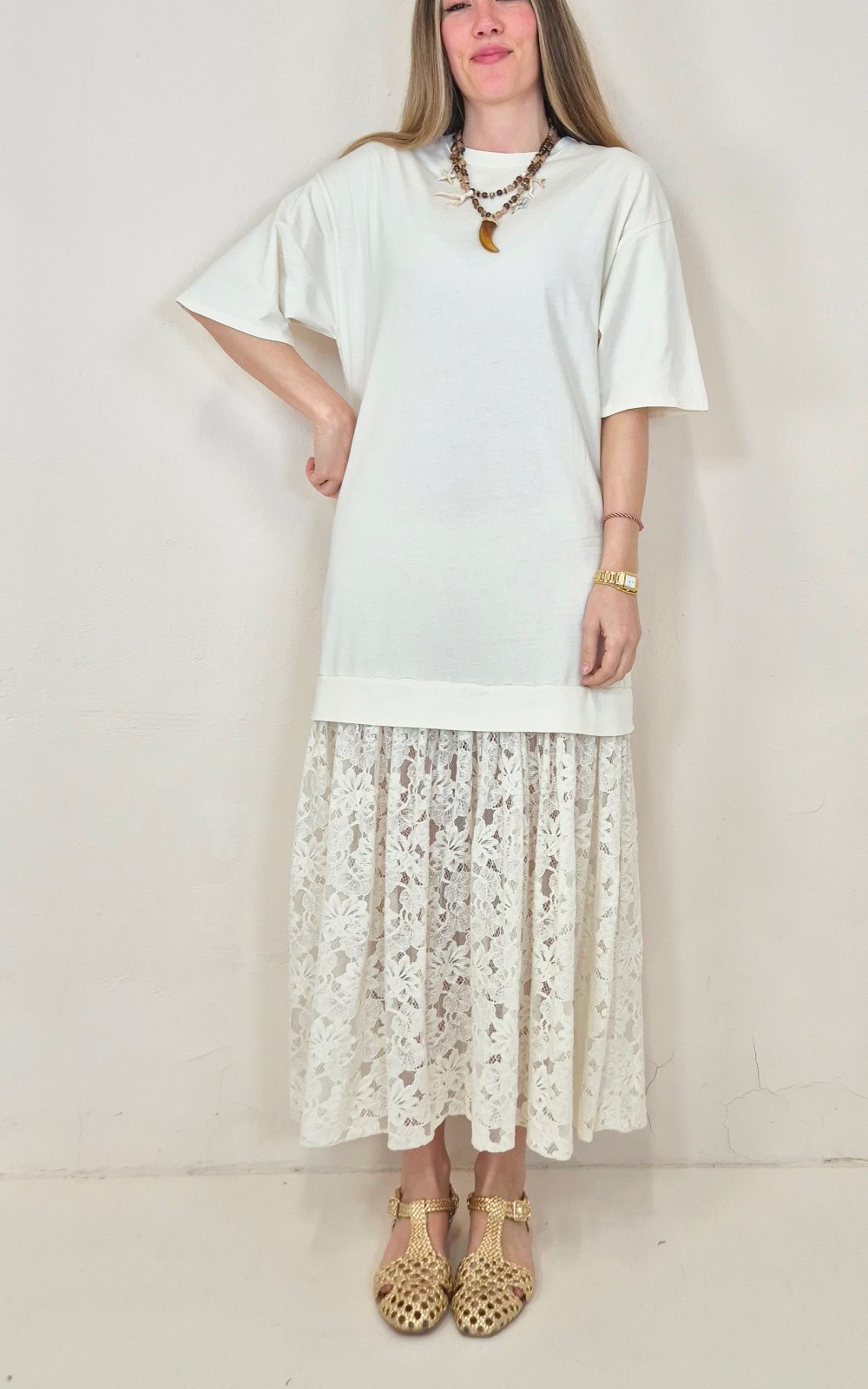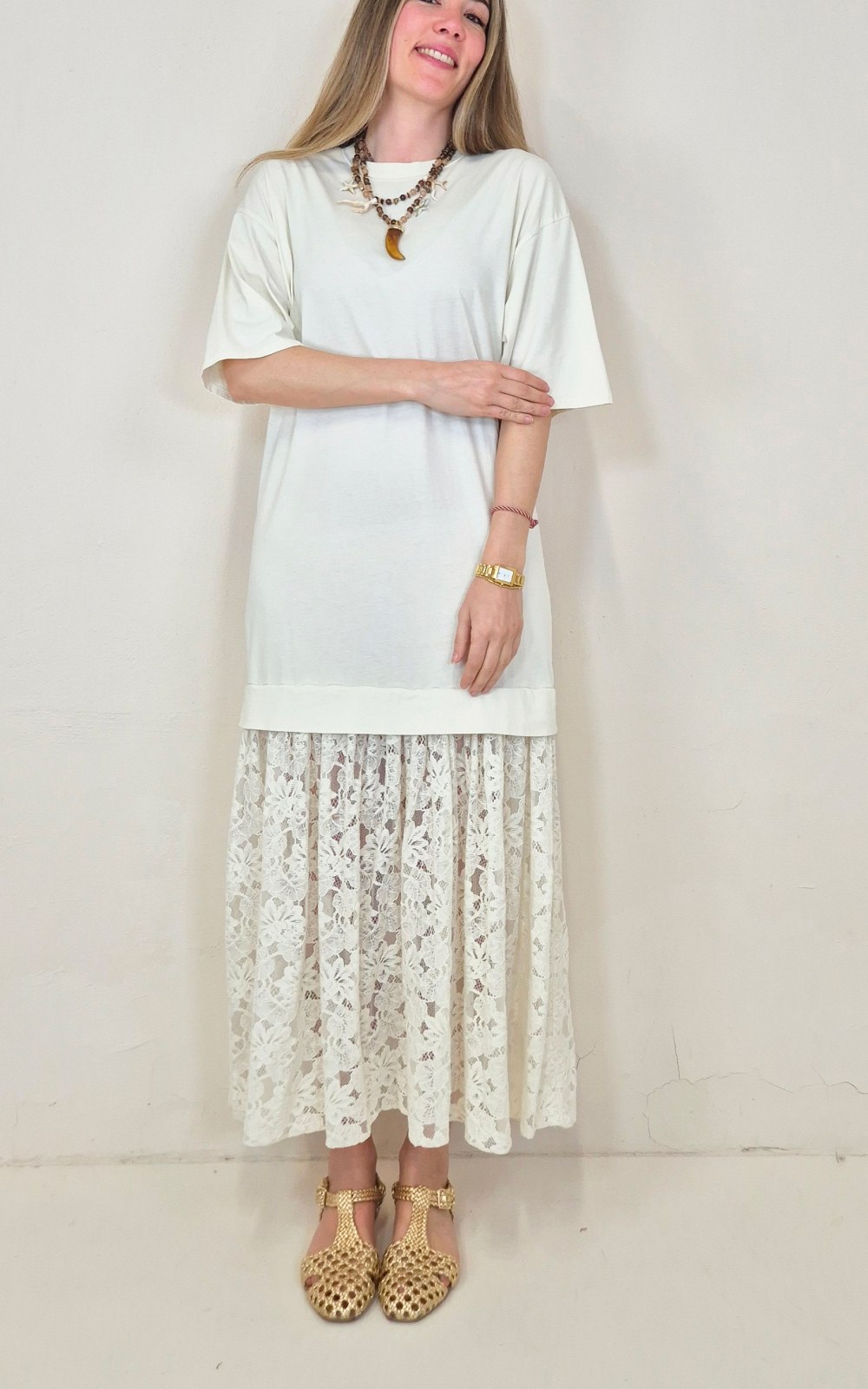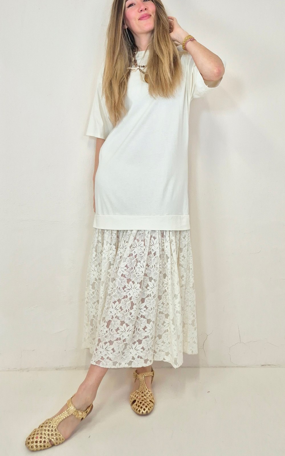 Vestido combinado en color crudo con cuerpo de algodón y falda de puntilla, una prenda especial que mezcla comodidad y detalle. La parte superior tipo camiseta aporta un aire relajado y actual, mientras que la falda de encaje le da un acabado más delicado y diferente. Un diseño fácil de llevar, perfecto para looks de diario con un punto especial.